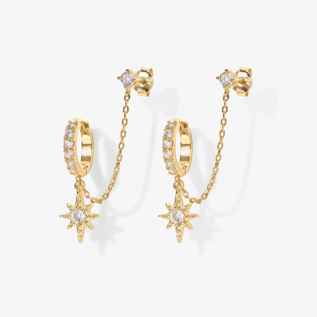 The Starlight Chained Huggie Earrings feature an 8mm diameter CZ huggie paired with an 11.5mm by 9mm dangling star charm, connected by a delicate 30mm chain. Complemented by a 3mm CZ stud, this set is designed for women with multiple piercings, offering a refined and elegant look. Crafted with premium AAAAA cubic zirconia, these earrings add a sophisticated sparkle to any ensemble.