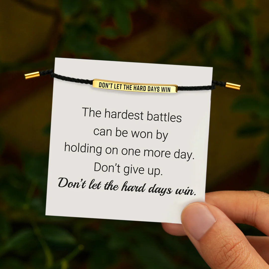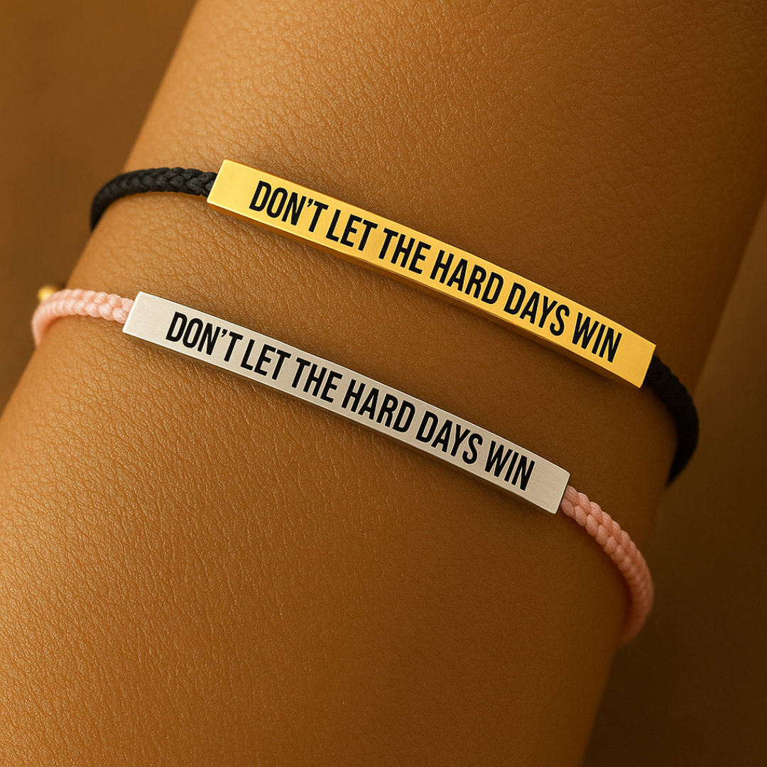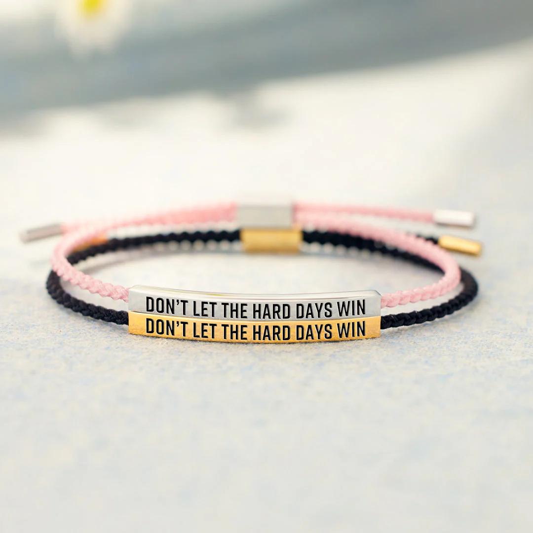 This elegant tube bracelet features the engraved mantra, "Don't let the hard days win," serving as a refined symbol of resilience and inner strength. Designed to inspire courage and determination, it offers a subtle yet powerful reminder to face challenges with grace. Whether gifted on meaningful occasions or worn daily, this bracelet embodies a steadfast belief in overcoming adversity and embracing perseverance. Let it be your constant companion in moments of struggle, encouraging you to rise above and declare your unwavering resolve.