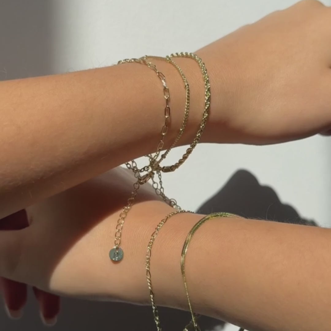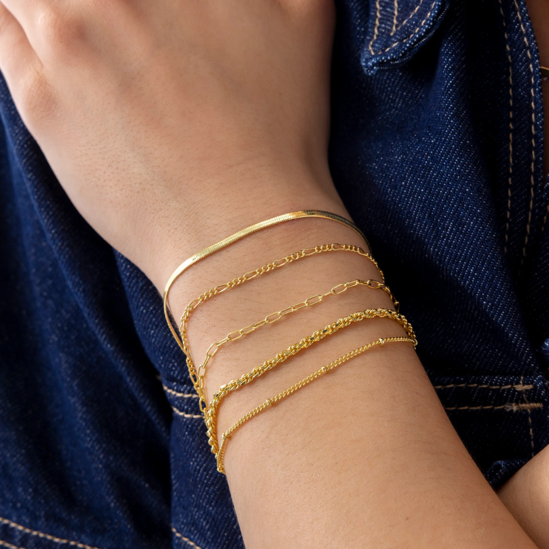 - Set includes 5 bracelet chains: 2mm wide paperclip chain, 2.5mm wide snake chain, 2.4mm wide beaded chain, 2.5mm wide rope chain, and 2mm wide figaro chain.
