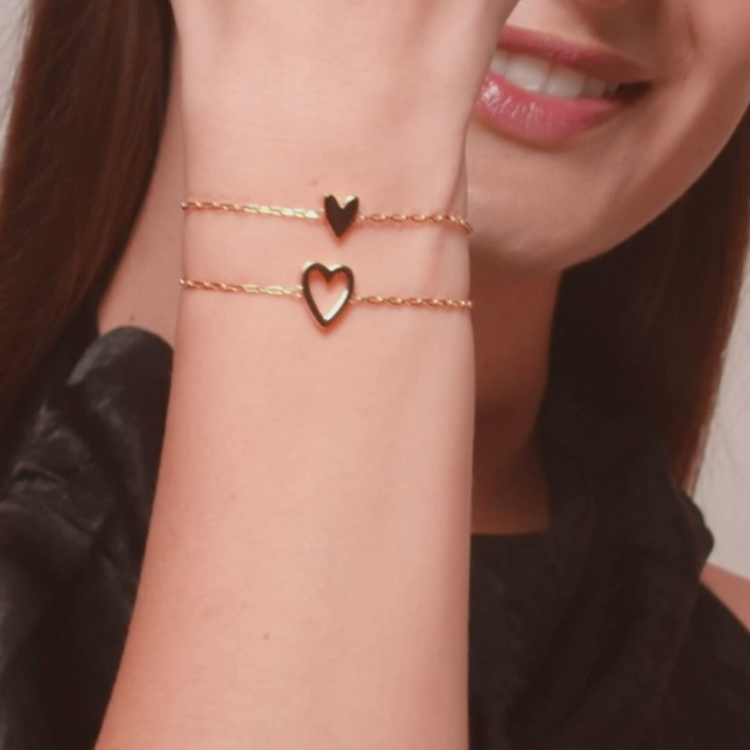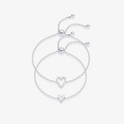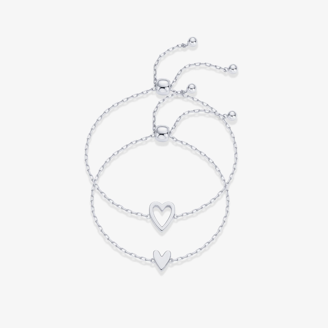 Enhance your elegance with our Heart Duo Charm Solitaire Bracelet. This refined pairing showcases two bracelets adorned with exquisite hollow and filled heart pendants. The adjustable length offers versatility—wear them individually or bestow one upon someone special. An ideal accessory to infuse your ensemble with subtle romance and polished charm.