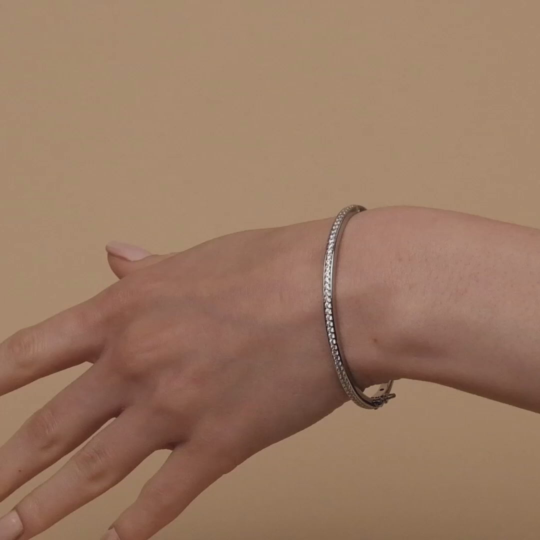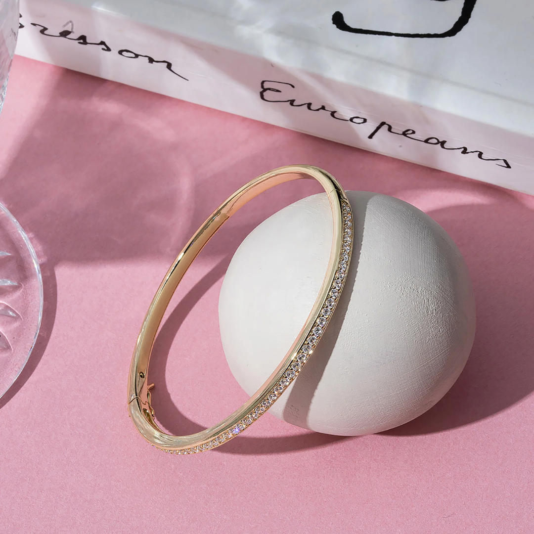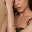 Introducing the Lana Bangle, a must-have accessory for your jewelry collection. Its sleek, minimal design is adorned with a subtle sparkle of cubic zirconia, making it perfect for any occasion. Elevate your style with this elegant and versatile bracelet.