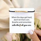 This light hearted reminder of "Remember Who the Fuck You Are" bracelet serves as a daily affirmation, discreetly empowering you to maintain your authentic self. The sleek tube design offers a refined aesthetic while carrying a powerful message that encourages self-confidence and personal integrity throughout your day.