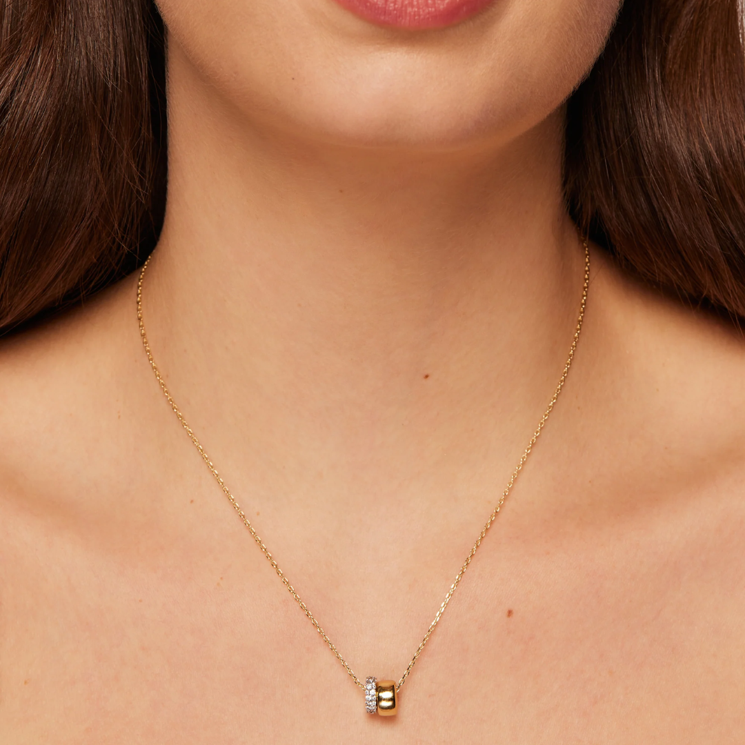 Enhance your ensemble with the Soho Pendant Necklace, a sophisticated dual-toned accessory showcasing two contrasting rondelle pendants—one minimalist in design, the other brilliantly embellished with premium AAAAA cubic zirconia stones. The adjustable sliding chain offers adaptable styling options for diverse settings. This refined piece brings understated luxury to any attire, effortlessly transitioning from day to evening wear.