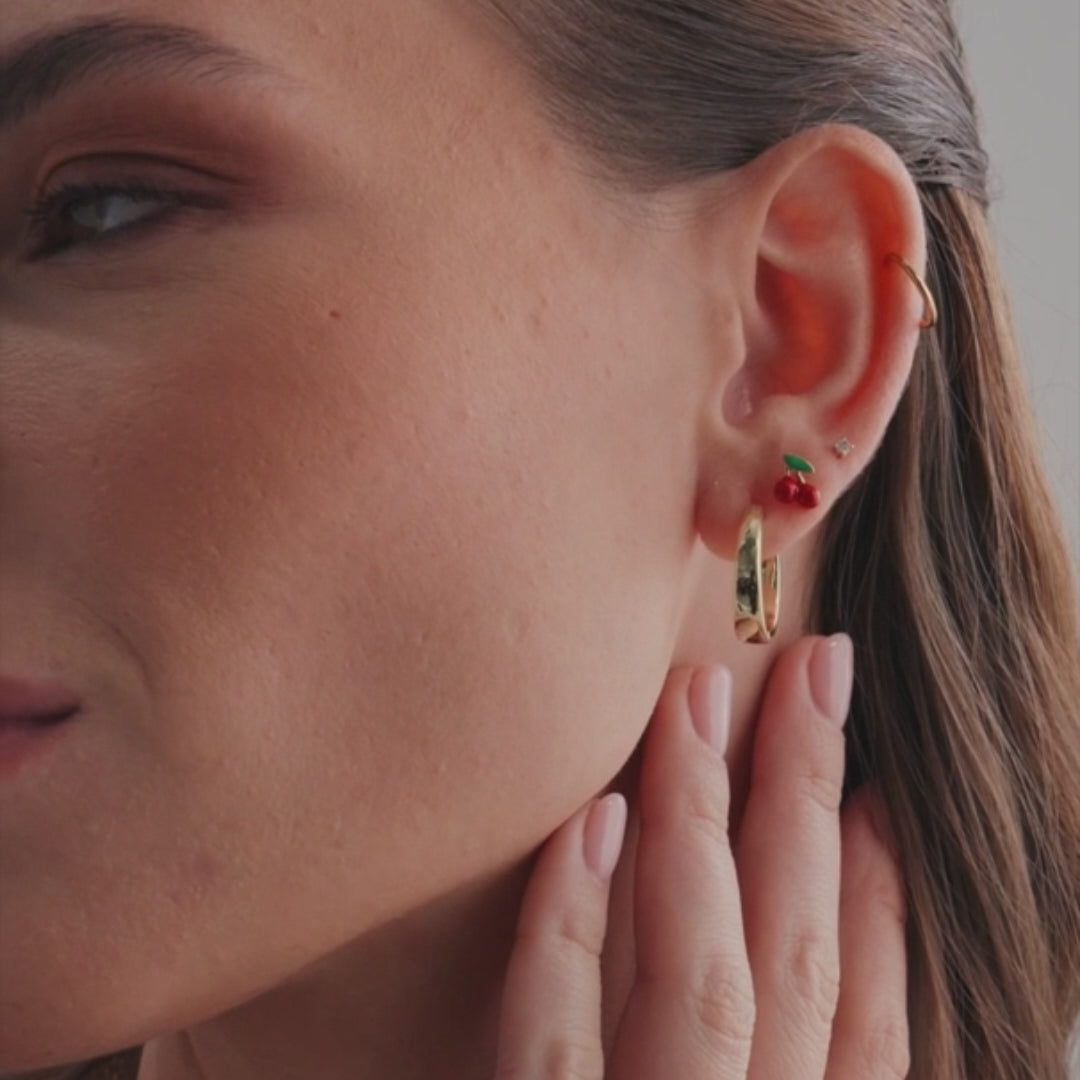 These Cherry Flat Back Studs offer a refined touch of playful elegance. Crafted with vibrant enamel, they bring a subtle yet distinctive pop of color to your look. Perfect for adding a delicate, sophisticated charm to any ensemble, these earrings are an effortless way to express your sweet style with understated grace.