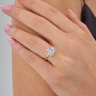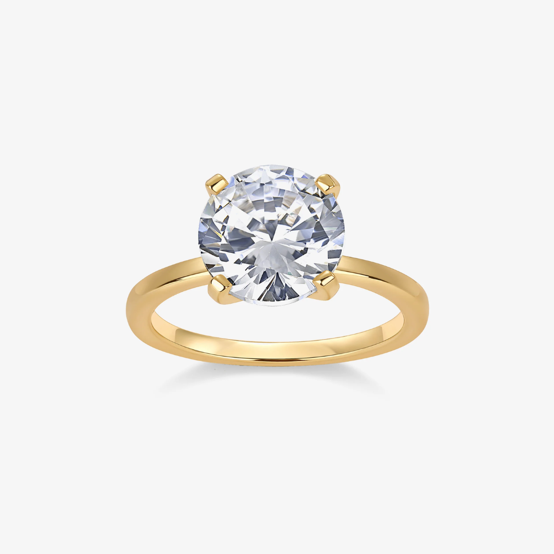 This Round Solitaire Engagement Ring embodies timeless elegance. Its 3CT round cubic zirconia and sleek 14K gold-plated band make a statement as a promise ring or stylish stand-in. Effortlessly elevate any look with this versatile, sophisticated piece. Perfect for saying "yes," or as a travel ring.
